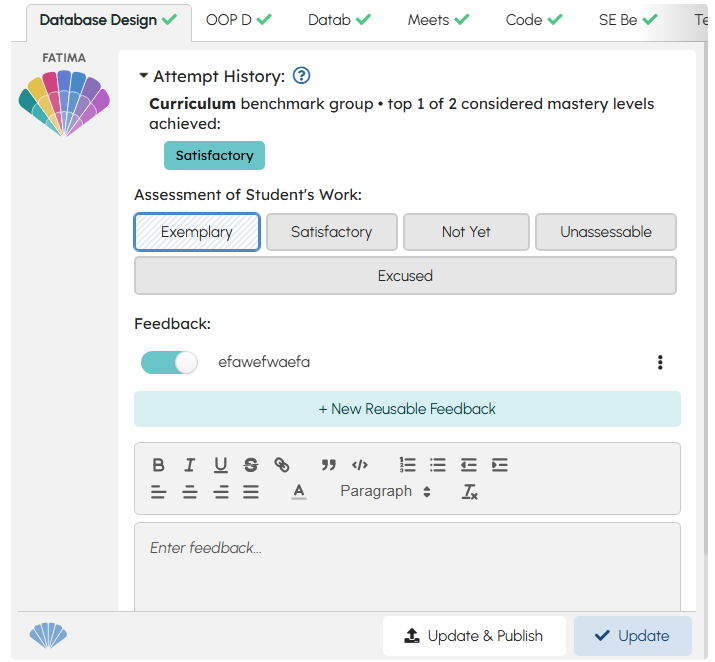 Resubmissions are built right into TeachFront. Students can choose which objectives they want to improve, explain what they changed, and upload revised work. Instructors see the new submission alongside the original, making it simple to give targeted feedback. The goal is to encourage growth — not punish mistakes — so students get clear chances to demonstrate progress without adding a mountain of extra grading work.